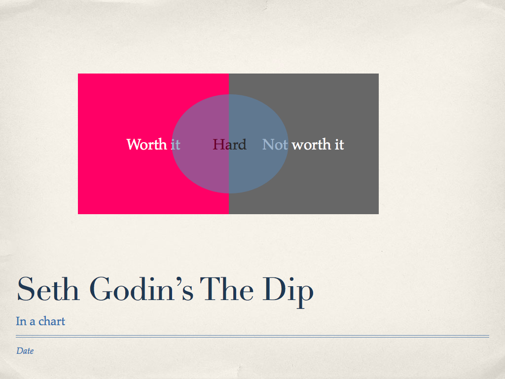 It’s no secret that I dislike most of what Seth Godin writes. Seth is witty, funny, and seems like a smart guy. So what’s not to like? I don’t like that was he says is mostly either trivial, or (worse) not at all backed up by any evidence, just Seth’s bald (pun intended) assertion. The Dip is an extreme example of Seth’s tendency to the trivial. Here it is summed up in a chart: